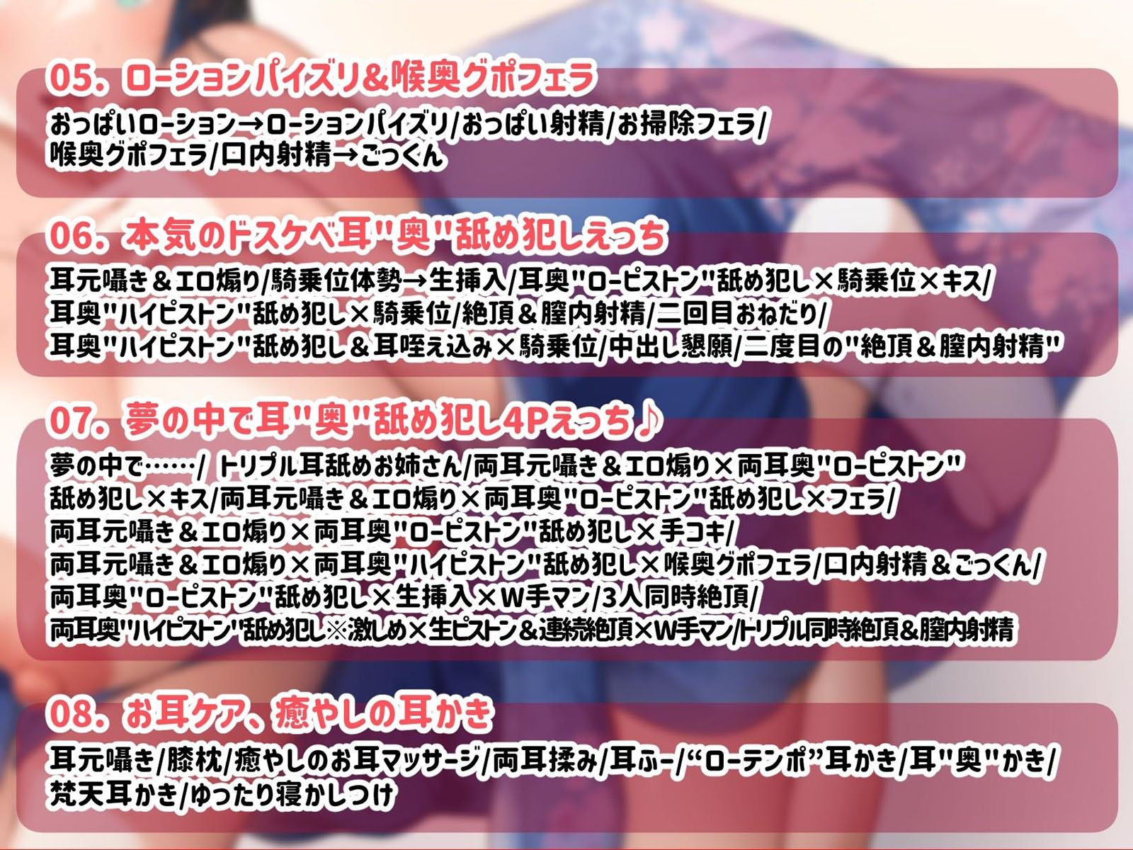 (夢の中で……/ トリプル耳舐めお姉さん/両耳元囁き&エロ煽り×両耳奥’ローピストン’舐め犯し×キス/両耳元囁き&エロ煽り×両耳奥’ローピストン’舐め犯し×フェラ/両耳元囁き&エロ煽り×両耳奥’ローピストン’舐め犯し×手コキ/両耳元囁き&エロ煽り×両耳奥’ハイピストン’舐め犯し×喉奥グポフェラ/口内射精&ごっくん/両耳奥’ローピストン’舐め犯し×生挿入×W手マン/3人同時絶頂/両耳奥’ハイピストン’舐め犯し※激しめ×生ピストン&連続絶頂×W手マン/トリプル同時絶頂&膣内射精)